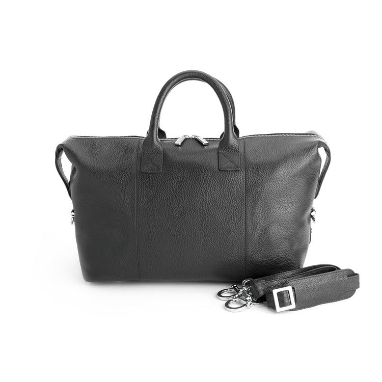 Travel in style with our leather overnight duffel bag, a perfect combination of luxury, durability, and functionality. Crafted from premium full-grain leather, this sophisticated luggage is designed for weekend getaways, business trips, or everyday adventures. Featuring silver-tone hardware for a refined touch, the duffel includes a spacious main compartment with two interior zippered pockets to keep your essentials organized. The adjustable leather shoulder strap ensures comfortable carrying, while the sturdy leather handles provide a classic, effortless grip. For added durability and protection, the silver metal stud feet keep the base elevated and secure on any surface. Whether you're heading to the airport or an overnight retreat, this timeless leather duffel is the perfect companion for the modern traveller.